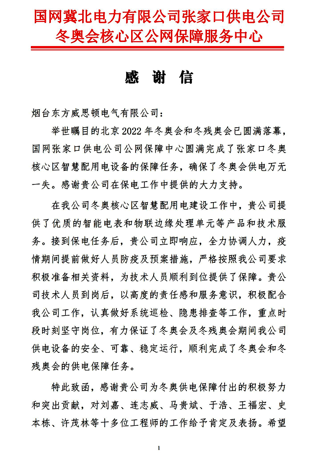 截至目前共有股份公司收到来自国网北京市电力公司、国网天津市电力分公司、国网冀北电力有限公司张家口供电公司、国网冀北廊坊供电公司的感谢信;威思顿公司收到来自国网冀北电力有限公司张家口供电公司的感谢信;国网中电公司收到来自国网冀北电力有限公司张家口供电公司的感谢信;玉麟公司收到来自中铁二局集团有限公司的感谢信。